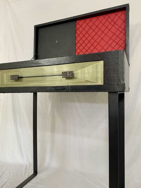 Comme un tiroir avec des casiers afin d’organiser vos biens de façon rapidement accessibles ; une façade rehaussée de marqueterie de paille (c’est de l’artisanat d’art!) mettant en valeur des poignées réalisées sur mesure par une artisane de la région (ca aussi!) ;-).